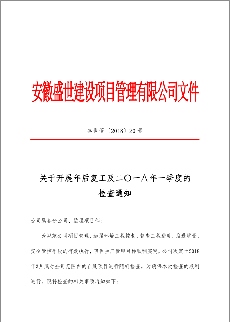 关于开展年后复工及二〇一八年一季度的检查通知 来源:开云官方网站 发布日期:2018-03-26 浏览次数:2153 上一篇:热烈欢迎六安蓝城运动小镇建设发展有限公司领导莅临公司考察指导 下一篇: 热烈祝贺我司中标巢湖项目
